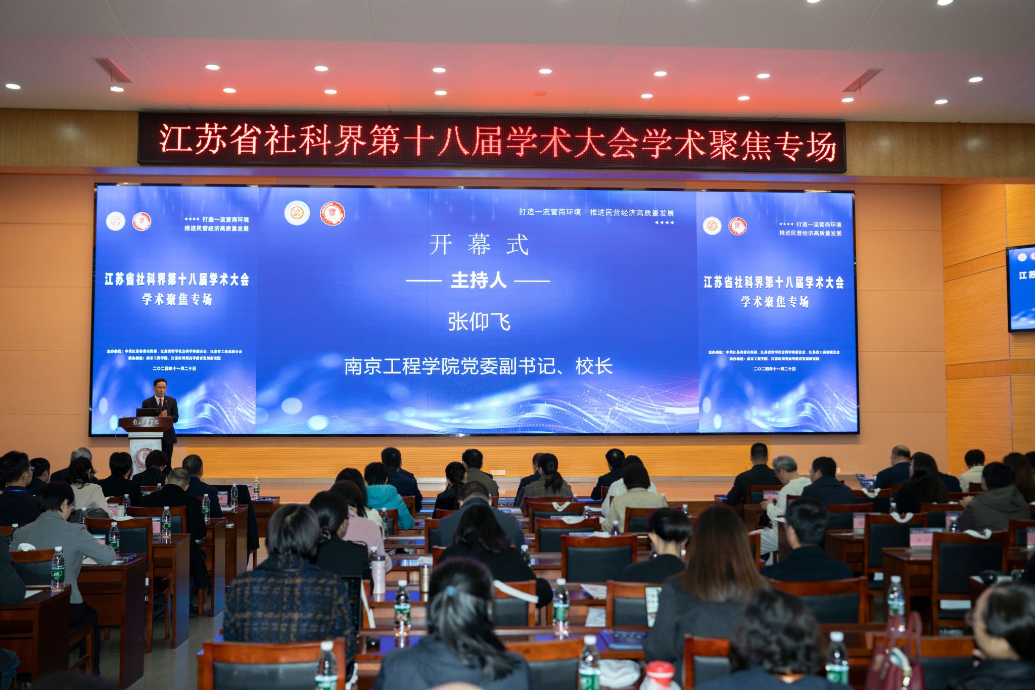 为深入学习贯彻习近平新时代中国特色社会主义思想,全面贯彻党的二十大和二十届三中全会精神,全面落实省委十四届七次全会精神,11月20日,由中共江苏省委宣传部、江苏省哲学社会科学界联合会、江苏省工商业联合会主办,凯发k8官网、江苏应用型高等教育发展研究院承办的江苏省社科界第十八届学术大会学术聚焦专场在我校举行。省社科联党组书记、常务副主席张新科,省工商联党组成员、副主席郭东升,省社科联党组成员、副主席刘西忠,省社科联组联中心主任王淑芬,我校党委书记孙爱武,党委副书记、校长张仰飞,党委常委、副校长汪群,党委常委、副校长陆华良,东南大学首席教授、经济管理学院原院长徐康宁,长江产业发展研究院特聘研究员、江苏省民营经济研究会创会秘书长、中国民营经济研究会理事吴跃农,南京康尼机电股份有限公司总工程师史翔,金陵金箔集团董事局主席江楠等出席开幕式。开幕式由张仰飞主持。