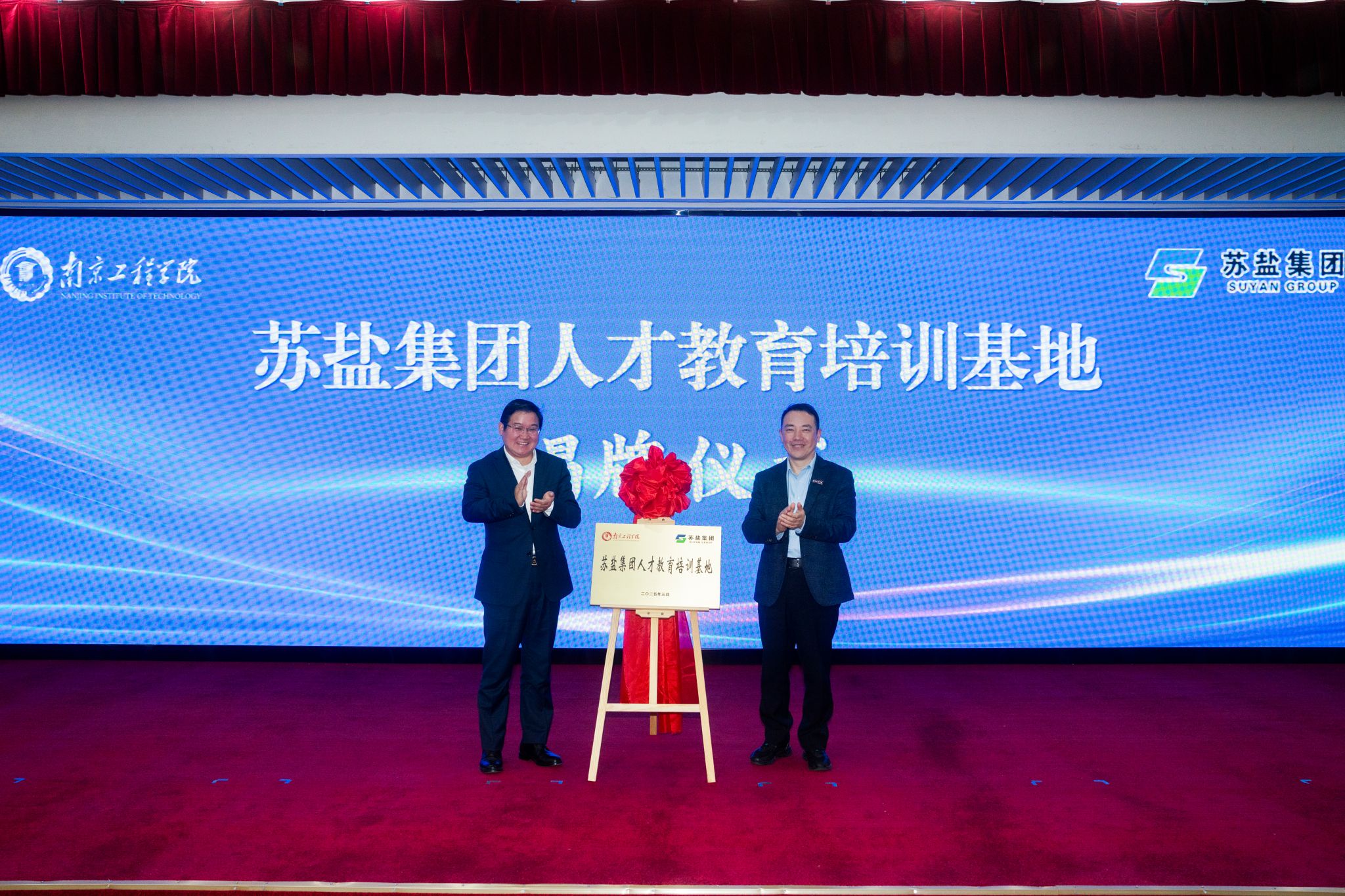 在与会人员的共同见证下,校企双方共同签订战略合作协议,并为“苏盐集团人才教育培训基地”和“大学生就业实习基地”揭牌。