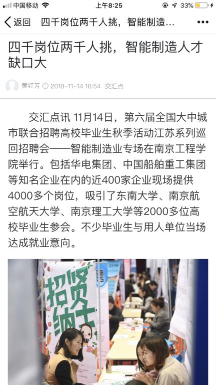 凯发k8官网自动化专业的左婷婷和两个舍友一起到现场求职。“好多企业需要我们这个专业,我挑了南京三家规模比较大的公司,”老家在盐城的左婷婷表示自己希望能在南京或者苏州工作,月薪在5000元以上。“从前两年学哥学姐的求职经历来看,这个愿望应该不难实现。”左婷婷对未来充满信心。南京师范大学电气工程及其自动化专业的魏力在与华电集团现场招聘负责人洽谈后当即签订了就业意向书。“我以前也面试过几次,觉得跟这家公司特别投缘,就签了,”魏力回答很干脆。