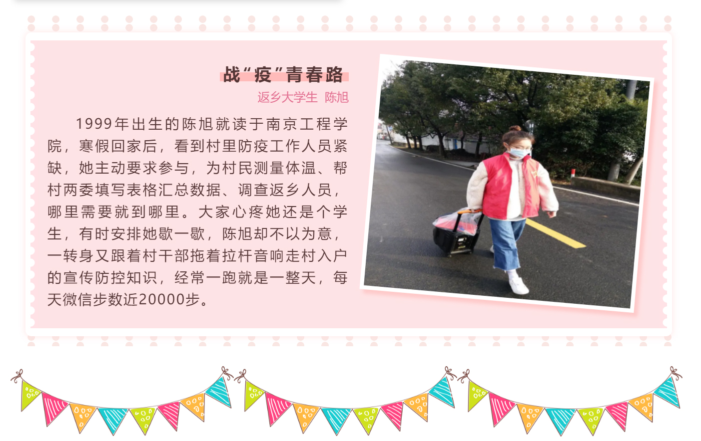1999年出生的陈旭就读于我校艺术与设计学院,寒假回到家乡宜兴西渚镇后,看到村里防疫工作人员紧缺,她主动要求参与,为村民测量体温、帮村两委填写表格汇总数据、调查返乡人员,哪里需要就到哪里。她的志愿行动获得了当地媒体的报道。