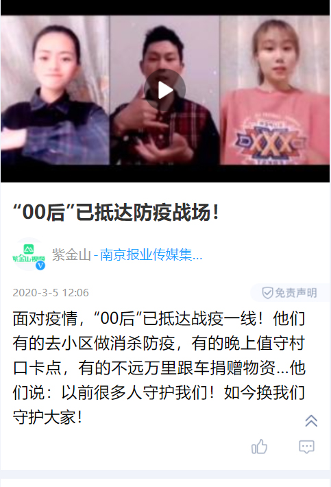 在“紫金山”发布的视频中,我校两名“00后”大学生进入大家的视野,他们分别是建筑凯发交通191班张津铭同学和材料科学与凯发焊接192班陈浩楠同学。张津铭在家乡吉林省吉林省延吉市进学街道义务对小区进行消杀,陈洁楠在南通海门市四甲镇靶场村志愿在卡口值班检查人员出入。他们用自己的志愿行动,述说着00后的青春誓言。