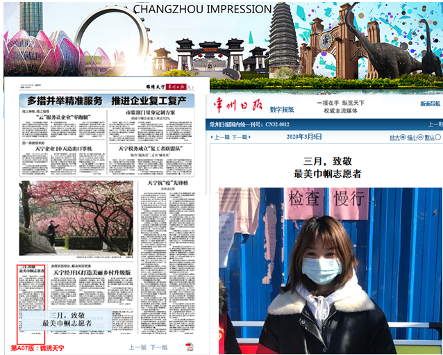 曹烨是我校艺术与设计学院环境设计171班学生,是最早报名在家乡常州解放村委参加志愿服务的大学生。“如果在防控疫情的志愿服务中需要人手的话,我很愿意出一份力。”这是2月初她在申请参加志愿服务时说的一句话。疫情期间,她穿上志愿者马甲,戴上红袖套,在天宁街道解放村委卡口处测量来往人员体温,登记来往信息。在闲暇时刻,她也不放松,主动帮助村里老人了解疫情防护知识。作为一名预备党员,曹烨同学牢记党的宗旨,发挥先锋模范作用,让大家看到了一名当代大学生的初心与责任。当地媒体《常州日报》对曹烨和社区志愿者们进行了报道。