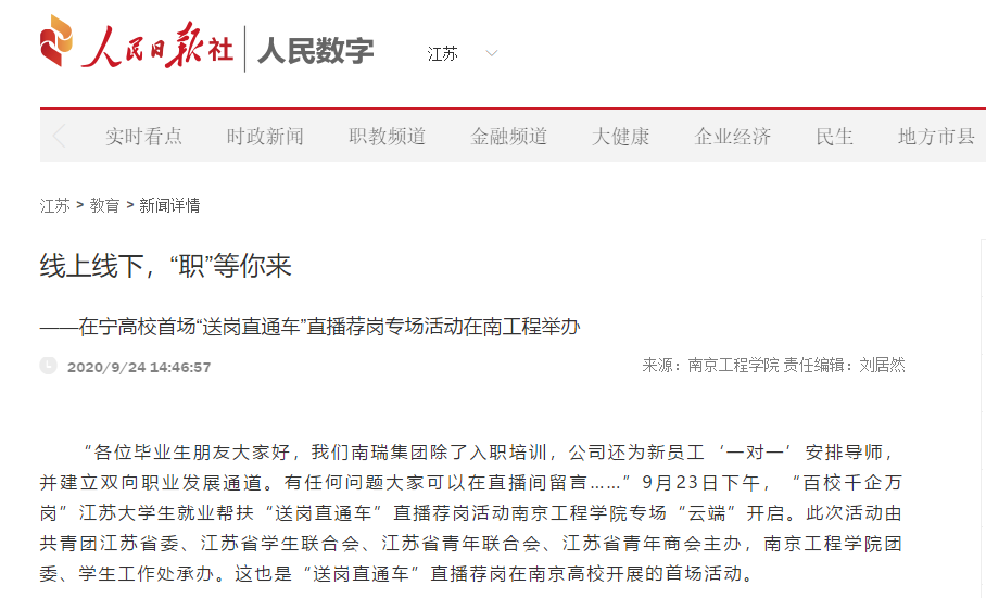 直播荐岗参会企业代表,南京康尼机电股份有限公司人力资源部部长段金莉在参加完活动后提到:“每年都到南工程来招聘,以直播与面试相结合的方式还是第一次,这次活动打破了线下招聘活动的地域和时间限制,对企业和学生来说,都是一种非常好的方式,为有就业需求的求职者和用人单位搭起交流平台,极大提高了企业选人的效率,也降低了学生求职的成本。”