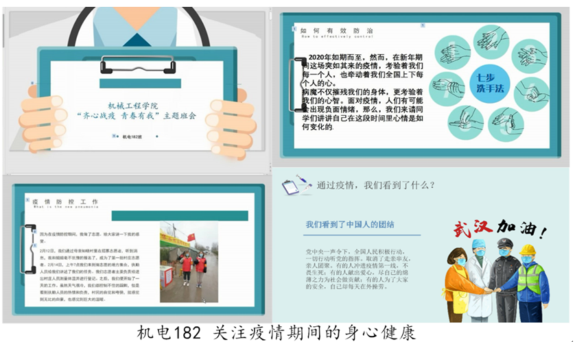 此外,各班级结合专业特色和年级特点,紧扣时事热点,丰富了班会的主题内容。机工161结合对疫情防控的学习和刚刚过去不久的“雷锋日”,深入学习“雷锋精神”和疫情中展现的志愿者精神的传承关系。流体171集中学习了武汉金银潭医院张定宇院长的感人事迹,他用渐冻的生命与死神竞速,堪称“医者仁心”的典范。机电182聚焦同学们的身心健康,开展了疫情期间的心理健康调查,呼吁大家学会调节压力、接纳负面情绪,用积极的心态应对生活中的变化。多样的主题充分激发了同学们的参与热情,体现科学性、教育性和创新性。